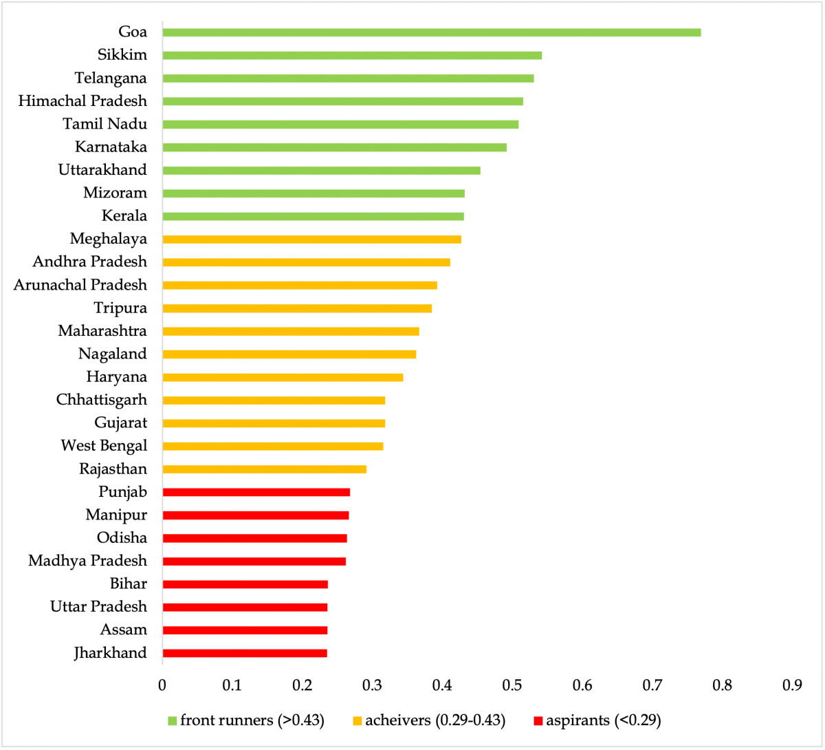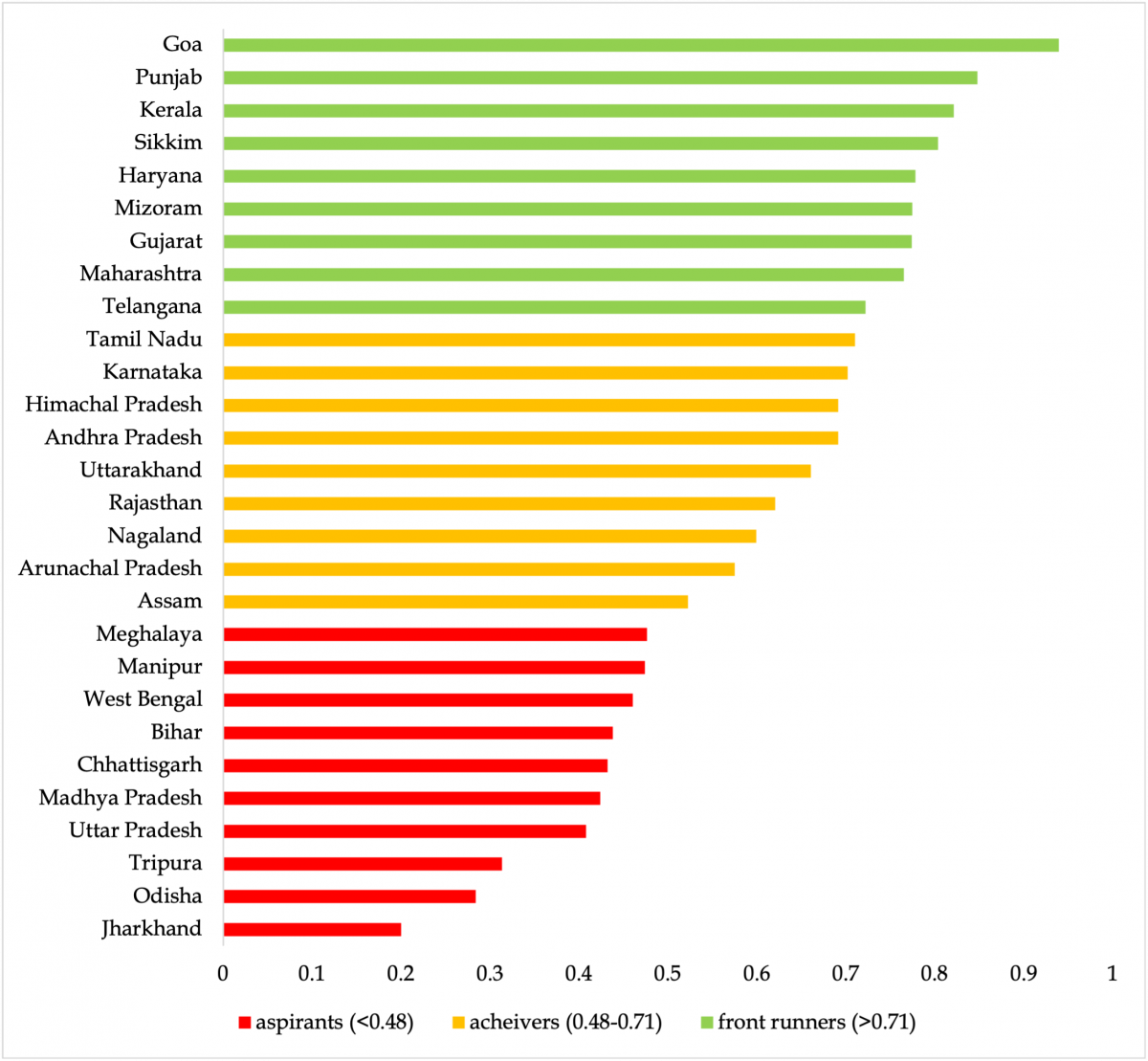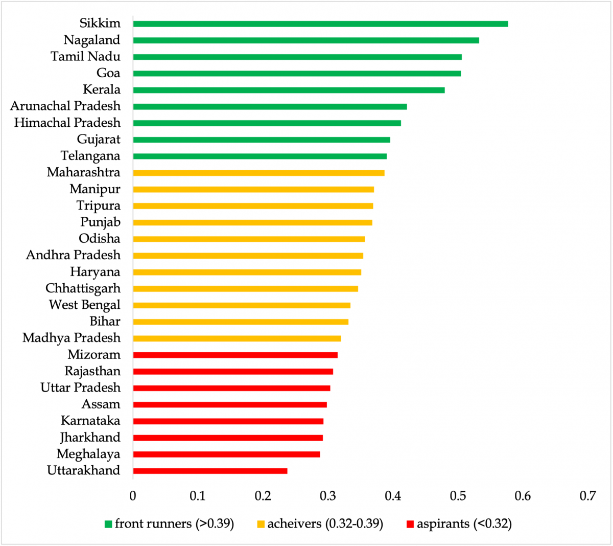 On the other hand, Aspirants including Jharkhand, Odisha, Tripura, Uttar Pradesh, Madhya Pradesh, Chhattisgarh, Bihar, West Bengal, Meghalaya and Mizoram have underperformed, with index values below 0.48. Goa outperforms all the states with its high performance in all the above mentioned dimensions.