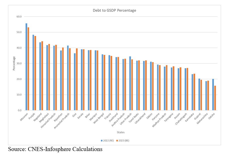 A few debt numbers below provide an illustrative account of Indian states’ fiscal position. The debt-to-GDP ratio at the state level is crucial for assessing specific financial conditions and policies. This localised ratio significantly influences credit ratings, budget decisions, and fiscal strategies, allowing states to uphold long-term financial stability and responsible fiscal management. Calculated by dividing a state's total outstanding debt by its GDP and multiplied by 100 to express it as a percentage, monitoring and managing this ratio empowers states to make informed economic policy choices.