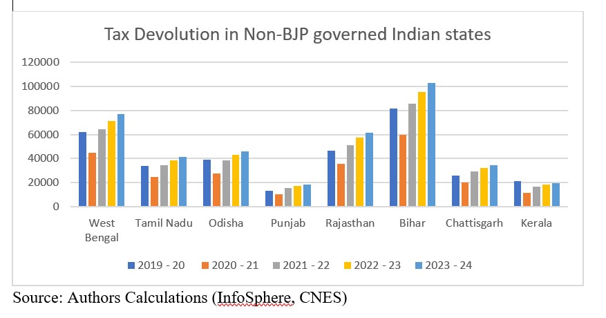 The figures below provide a ‘select’ look at the Centre to state tax devolution levels for a few opposition-governed versus BJP-governed states (refer here for source on this).