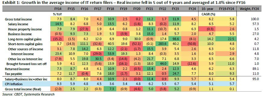 The core income (salary, business income, and other income ex-capital gains), which accounts for 95% of the total income, grew by 5.7% in FY24 and averaged 5.4% over the past 5 years. Thus, while the income growth from capital gains has been the highest, it had little impact on the average household income. Accounting for just 5% of the average income, capital gains contracted by 18% in FY24 after a huge 80% in the previous year.