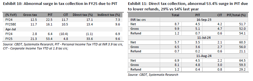 The stupendous rise of the income tax collection at Rs. 3.9 lakh crore in FY25 (April-July) by 53.4% YoY has led to the growth of gross tax collection by 21% YoY at Rs. 10.8 lakh crore. Contrastingly, corporate income tax revenue has risen by a modest 4.8% (Rs. 1.8 lakh crore YTD) which is 54% lower than income tax collection. This anomaly is largely attributable to lower income tax and higher corporate tax refunds compared to last year.