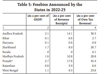 “...it is necessary to distinguish them (freebies) from public/merit goods, expenditure on which brings economic benefits, such as the public distribution system, employment guarantee schemes, states’ support for education and health. On the other hand, provision of free electricity, free water, free public transportation, waiver of pending utility bills and farm loan waivers are often regarded as freebies,” it states.