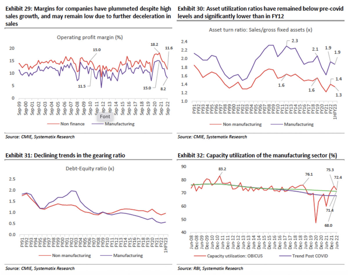 My sense is that an increased government capex outlay, as welcomed it will be in the short term, may actually do very little to change the underlying circumstances for the overall investment situation, where at 75% private sector capacity utilisation, most of the private firms remain reluctant to invest more or in new capacity. The charts below reflect the full story in data. Margins for companies have plummeted despite high sales growth, and may remain low due to further deceleration in sales. Asset utilisation rations have remained below pre-covid levels and significantly lower than in FY12.