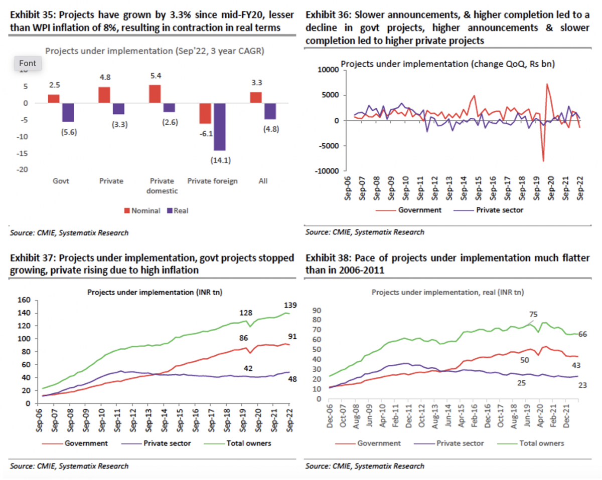 The futility of a failed private investment crowding-in strategy may, in the near future, give way to crowding-out effects, which will be subsequently worse for growth prospects in a climate of global investment uncertainty. Moreover, as the charts below show, many public and private projects under implementation have contracted over time due to a number of factors. Pace of projects (public and private) under implementation has been much flatter than, as seen in the 2006-2011 period.