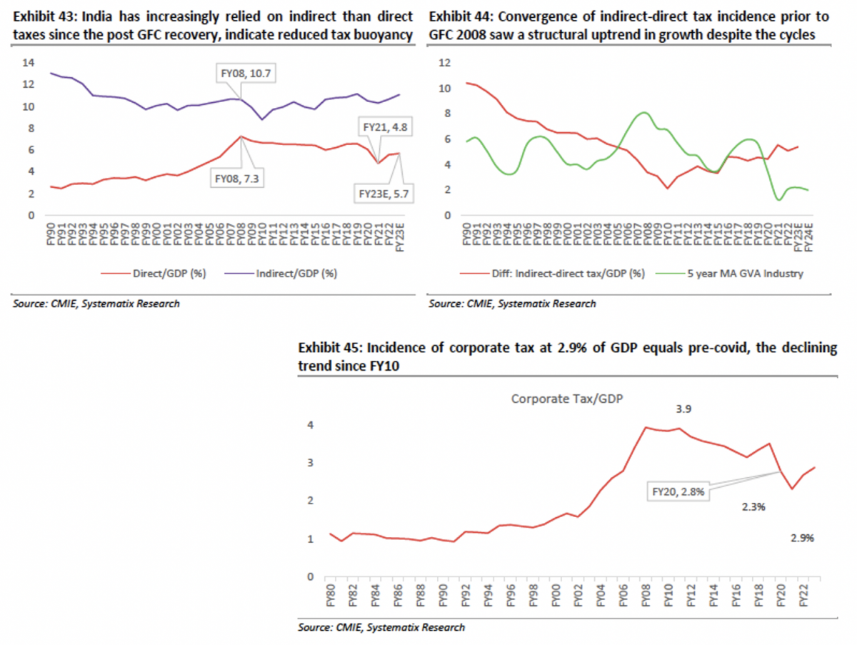 The indirect taxes/GDP ratio increased to 11% from lows of 8.8% in FY10, more recently through the increase in taxes on fuel and broad basing GST to even basic consumption items. This significantly reversed the convergence between indirect and direct tax incidence during the period of FY90-FY10, which saw a sharp decline in indirect tax rates and a spectacular gain in tax buoyancy led by higher direct tax incidence (See Exhibit 43-45 below sourced from here).
