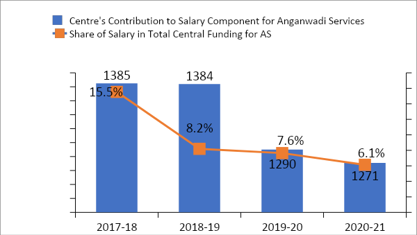 The share of the Centre’s contribution to the salary component under anganwadi services has been declining since 2017-18, when it cut down a big number of sanctioned posts. Additionally, the share of the salary component in total Central funding for the scheme has been going down consistently. This is a glaring systemic issue under the scheme, and even fiscally stronger states have vacancies at different levels. This is so as the states are not in a position to fund these posts, they have been asking for higher fiscal support for salaries in their annual programme implementation plans (APIPs). When crucial positions like that of a child development project officers (CDPOs), lady supervisors remain vacant, it hinders the implementation of the scheme and the quality of service delivery.