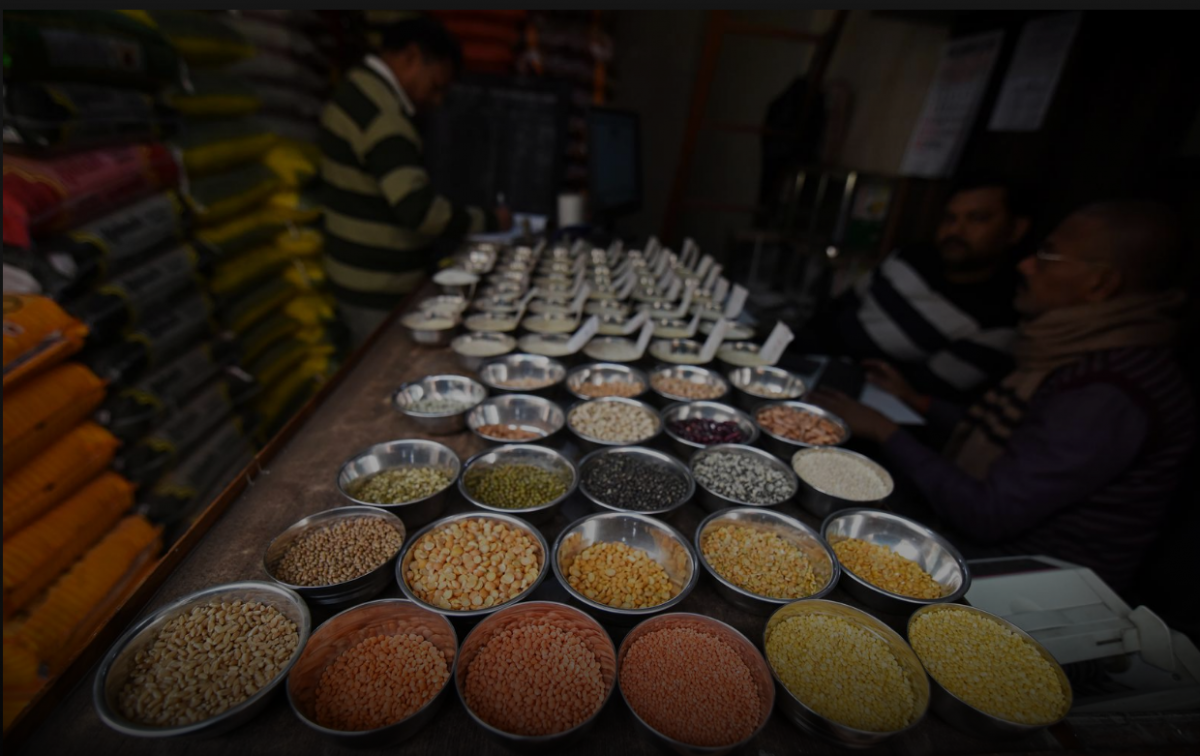 Pulses are kept on display for sale inside a shop at a wholesale market in Guwahati, February 1, 2018. Photo: Reuters/Anuwar Hazarika/File Photo