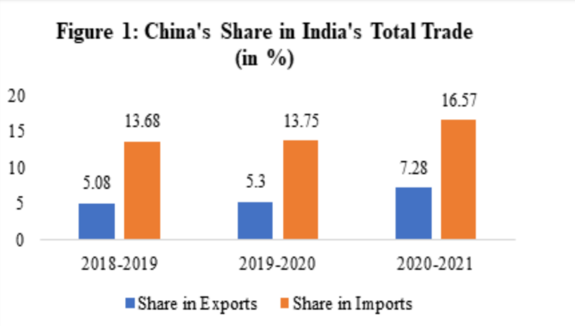 Trade data suggests that China’s share in exports has increased from 5.08% in 2018-19 to 7.28% in 2020-21 (See Figure 1). On the imports side, the share of China has increased from 13.68% to 16.57% over the same period. These emerging trends indicate that India has developed a significant amount of dependence on trade with China.