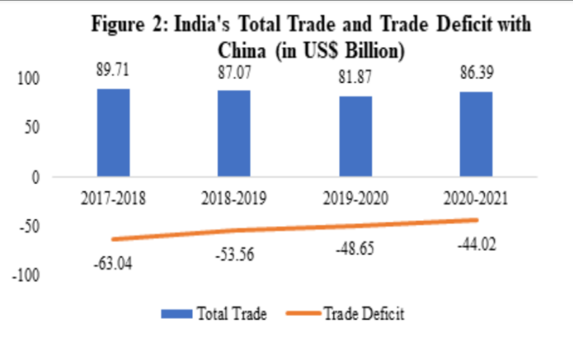 In the last four years, India’s trade with China has averaged around $86.3 billion, with imports exceeding exports resulting in a trade deficit (See Figure 2). While India has taken several steps to bridge the deficit, even though narrower than before, a substantial deficit still exists. In 2020-21, India registered a trade deficit of $44 billion.