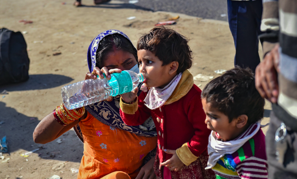 Migrant workers along with their family members take rest after they set forth to their their villages on foot, amid a nationwide lockdown in wake of coronavirus pandemic, at Lal Quarter Bus Stand in New Delhi, Sunday, March 29, 2020. Photo: PTI