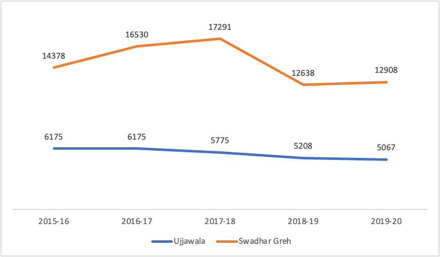 Other important schemes for empowering and protecting women have also seen consistent underutilisation of the limited resources allocated to them. These include Ujjawala which works on rescuing and rehabilitating victims of trafficking, and Swadhar Greh, which provides food, shelter and medical services to women in difficult circumstances. Both schemes have seen a decline in beneficiaries since 2015-16.