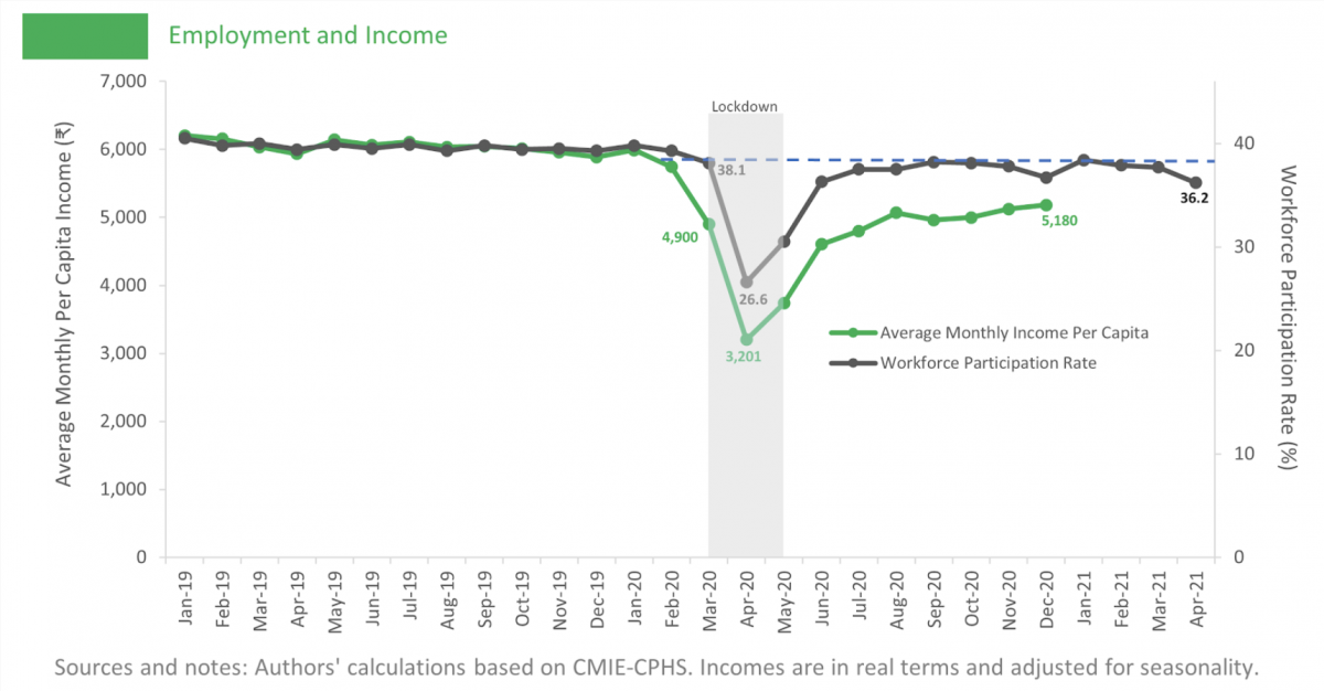 As per CMIE data, employment had returned almost to pre-pandemic levels by the end of 2020, but incomes remained significantly depressed and around 15 million workers still remained out of work (Figure 1). Thus when the second wave hit, households had not fully recovered from the shock of the first wave. As the worst of the health impacts of the second wave recede, the question of livelihoods remains urgent. As of now there is a lack of data on the impact of the second wave on household incomes. But whatever information we do have, suggests that the state-level lockdowns and curfews would have resulted in significant loss of incomes. [Footnote]For more information on trends in employment rates (for men and women) and income levels (rural, urban, overall) over the last year using CMIE data, see here.[/footnote]