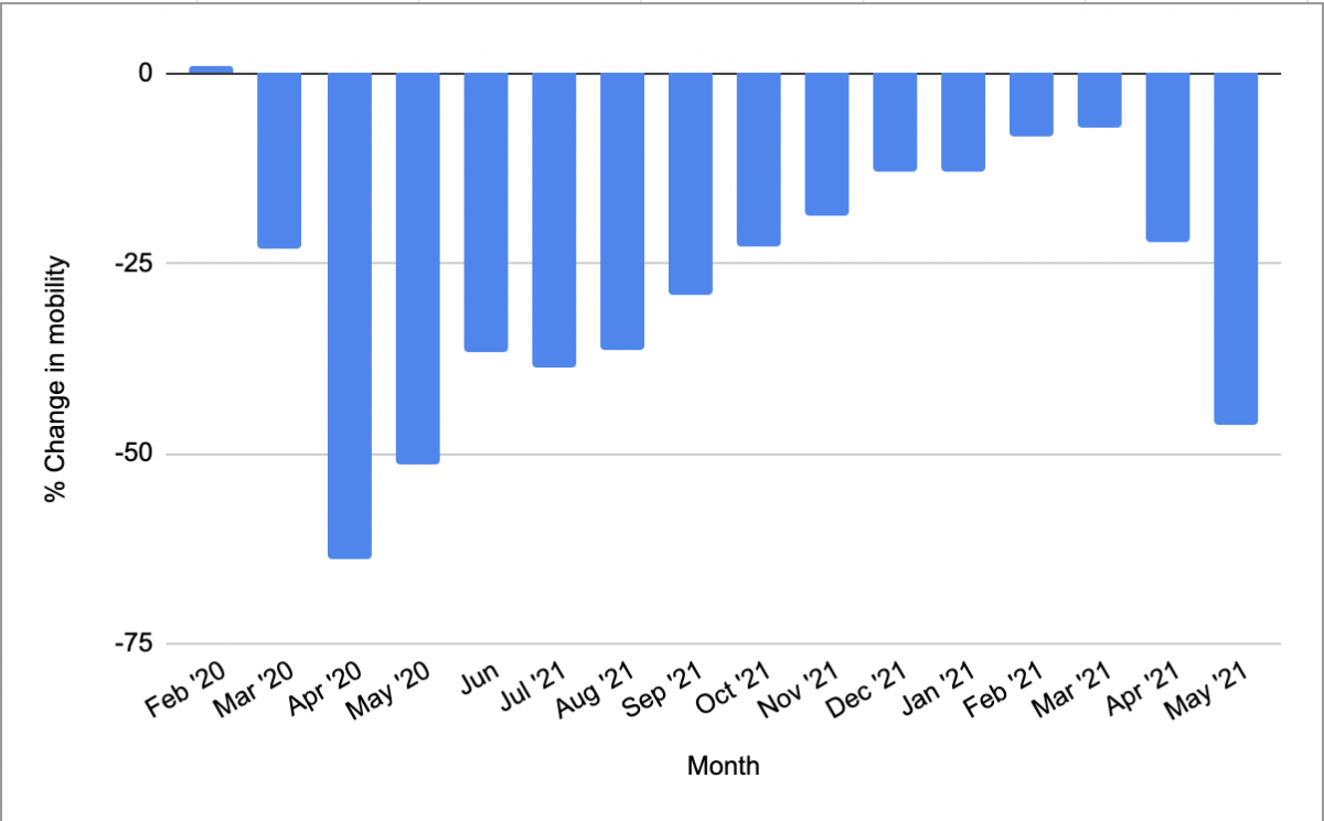 Mobility had almost recovered to pre-pandemic levels by March 2021 (7% below baseline). When the second wave hit and renewed restrictions were put in place, mobility dropped sharply in April (by 22%) and then even more steeply in May (by 46%). For comparison the fall in May 2020 was 51% (Figure 2). If we assume a similar relationship between mobility and incomes as seen during the first wave, this suggests that in May 2021 incomes would have fallen almost as steeply as they did during the nationwide lockdown last year.