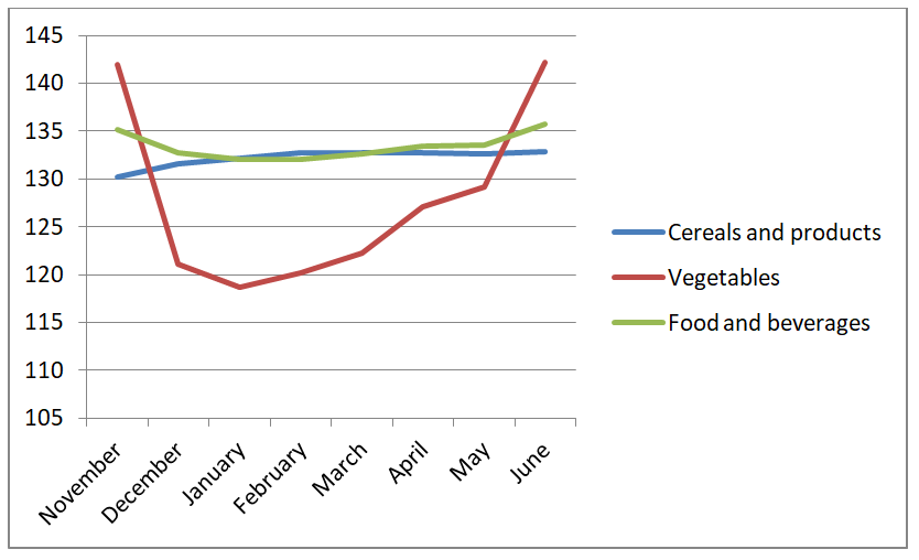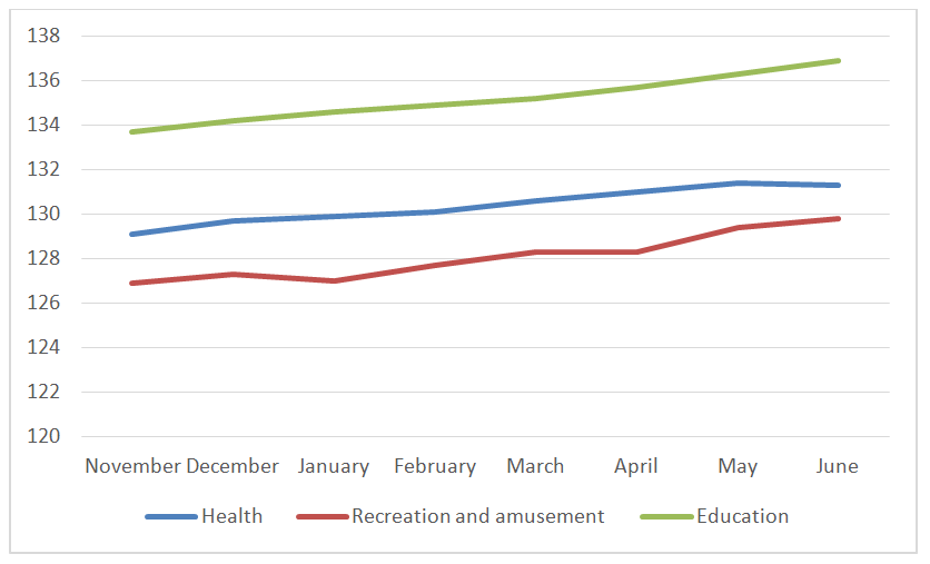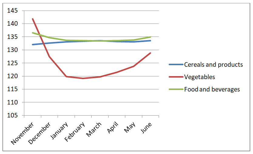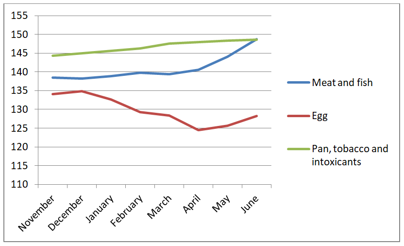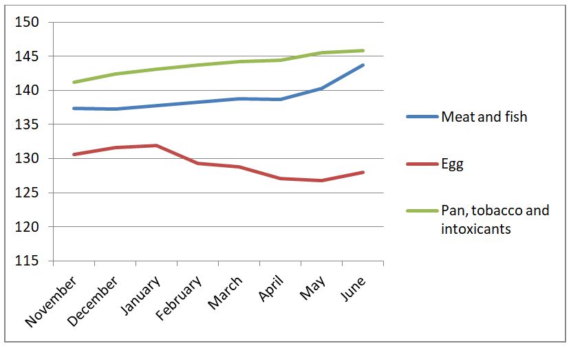 This is quite natural: whether people have income or less income, if they fall sick they will have to visit the doctor. Similarly, for sin-items such as pan, tobacco, and intoxicants, the addicted do not care whether they have income or less income. What is however surprising is that the price of meat items shows an increase post-demonetisation. The causal relation of the Uttar Pradesh meat-ban (leading to less supply of meat in the market and hence a higher price) is yet to be scientifically validated, but that can be a possibility. In these graphs, to capture the effect of demonetisation on prices we consider the Consumer Price Index. The data is sourced from data.govin.