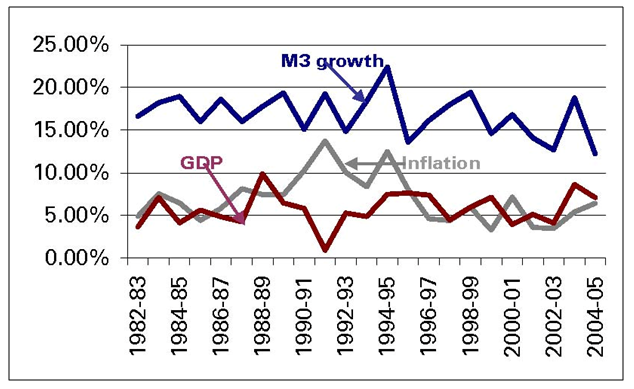 Ex-RBI governor and the former chairman of the Prime Minister's Economic Advisory council, C. Rangarajan also argues for a strong link between money supply growth and inflation. He finds the long-run elasticity of money supply with regard to money supply is close to unity. This is the likely basis for the RBI’s consistent belief in the role of money supply in affecting inflation.