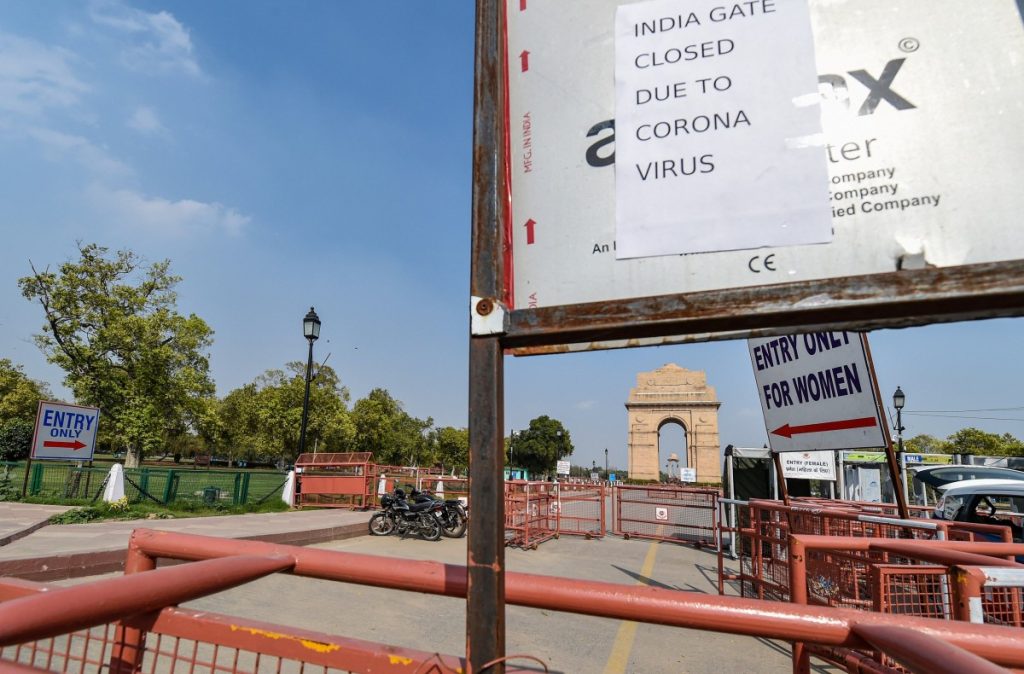 A notice put up at a barricade which says that India Gate has been closed to prevent mass gathering of tourists, March 19, 2020. Photo: PTI/Arun Sharma