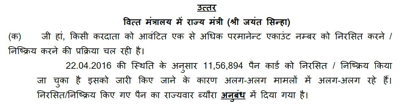 This figure is an interesting one – in 2007, the government said that 11.43 lakh duplicate PAN cards were deleted. And after nine years, in 2016, the governement said that 11.57 lakh duplicate PAN cards were deleted. This means that in nine years, only 0.14 lakh duplicate PAN cards were detected and deleted. This means there has not been a large increase in duplicate PAN cards at all. Of course this may be due to the fact that cases of duplicate PAN cards decreased as software capabilities increased or the awareness of the illegality of this increased.