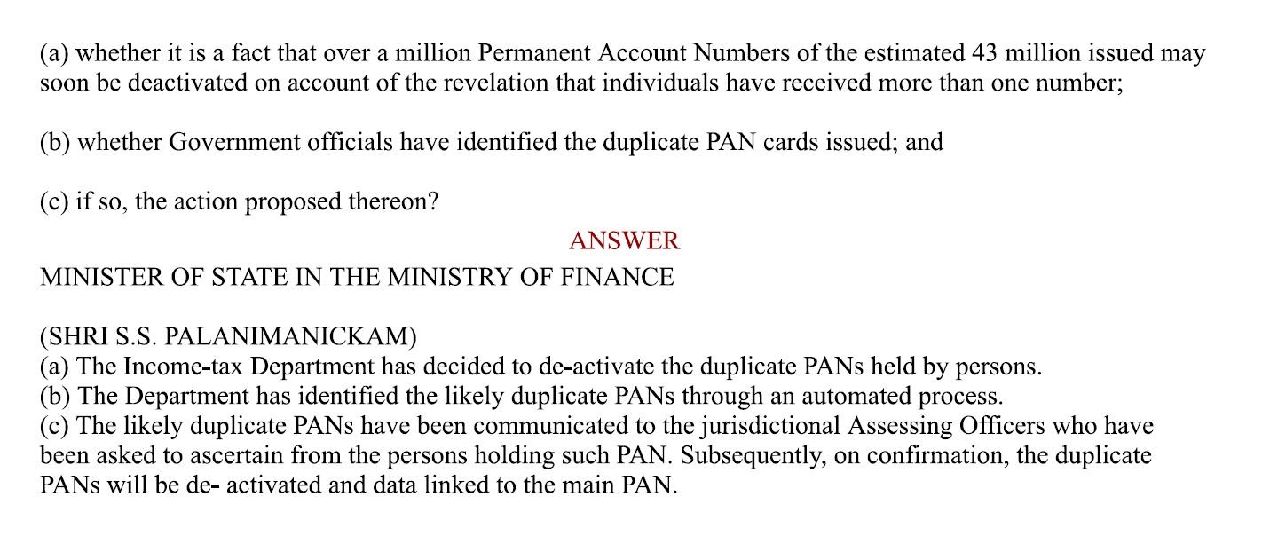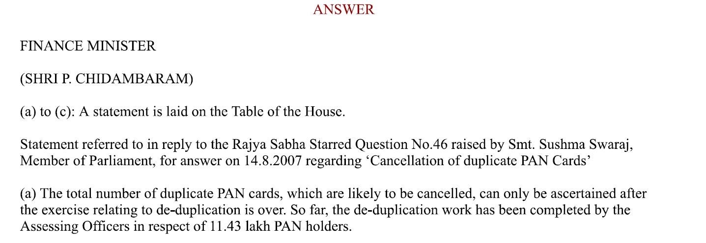 That same year, Sushma Swaraj raised a question on this and then finance minister P. Chidambaram answered it. Chidambaram said that the de-duplication of 11.43 lakh PAN holders had already been done.