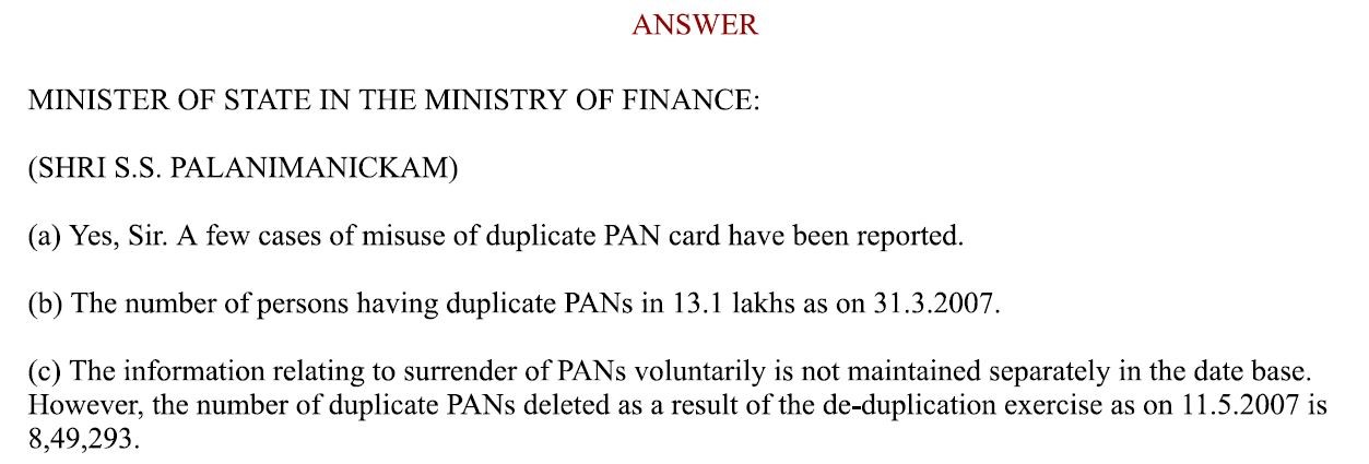 An answer to a related question in 2007 told us that there are very few cases of misuse of duplicate PAN cards. The finance ministry also said that around 13 lakh people were found to have duplicate PANs and after de-duplication, this number was trimmed to 8.5 lakh people.