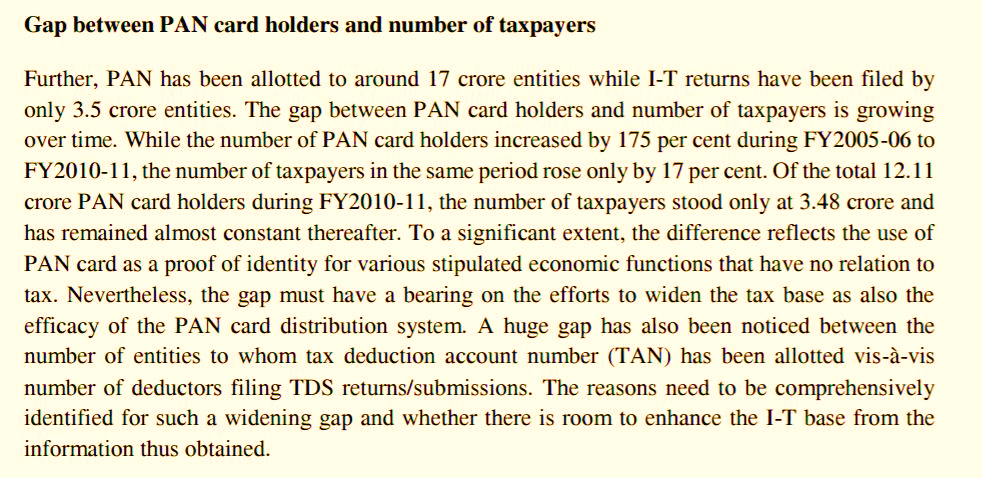 Secondly, all PAN card holders are not tax payers. It is compulsory to quote PAN in all documents pertaining to various financial transactions prescribed under Rule 114B of the Income-tax Rules, 1962. This is amended from time to time to bring more transactions under monitoring and to widen the income tax net. PAN is also mandatory for everyone who falls in the criteria fixed in Section 139 A of the Income Tax Act, 1961. This issue was discussed in the third report of the Tax Administration Reform Committee Report (TRAC) in November 2014, which was submitted to the finance ministry. The report says, “to a significant extent, the difference reflects the use of PAN card as a proof of identity for various stipulated economic functions that have no relation to tax.”