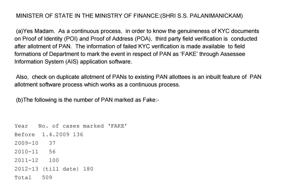 As recently as four years ago, in 2013, the government told Lok Sabha that the total number of fake PAN cards detected by authorities between 2009 and 2013 was only 509. In the years before this, the government said 136 fake PAN cards had been found, bringing the total number of fake PAN cards to 645. The government said that fake PAN cards were detected through the Know Your Customer (KYC) verification followed by field verification.