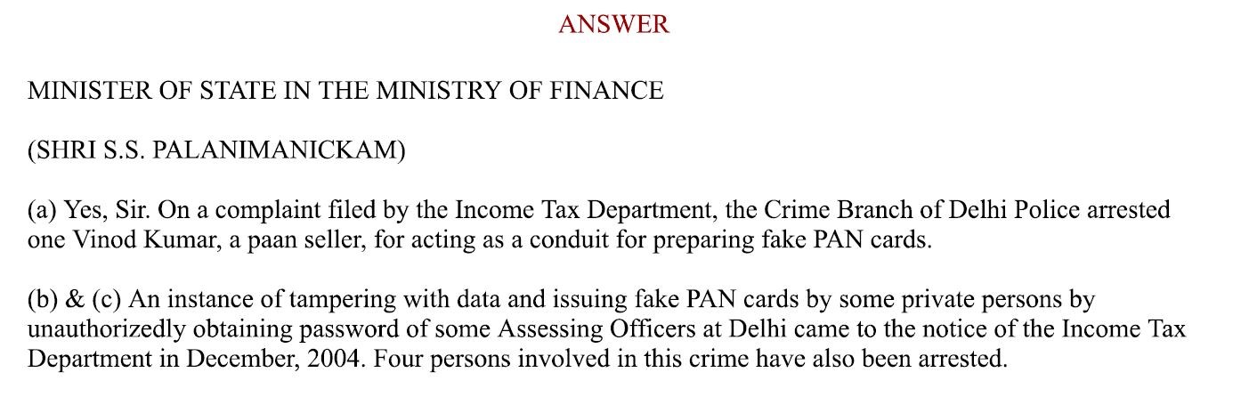 The case of fake PAN cards is also significant. In 2005, this issue of forged cards was raised in Rajya Sabha, in an interesting case of a paan seller acting as a conduit for fake PAN cards.
