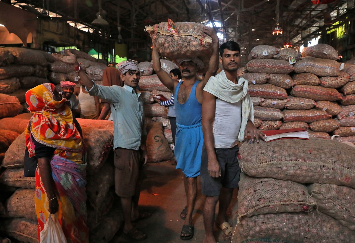 FILE PHOTO: A labourer carries a sack of onions at a wholesale market in Kolkata, India, December 14, 2021. REUTERS/Rupak De Chowdhuri