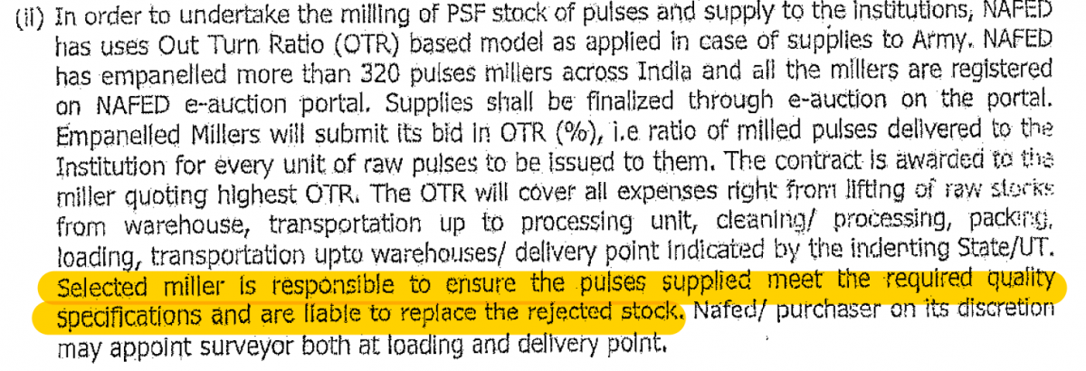 In a letter addressed to the DoCA, then NAFED managing director Sanjeev Chadha said millers would be responsible for quality of pulses supplied. Source: RTI