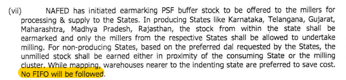 NAFED, on April 2, 2020, told the DoCA that it would dispose of stocks stored in the warehouse closest to the destination. ‘First In, First Out’ would not be followed for auctions under the PMGKAY, it said. According to NAFED, it was recommended by the Committee of Secretaries – an inter-ministerial group of top bureaucrats.