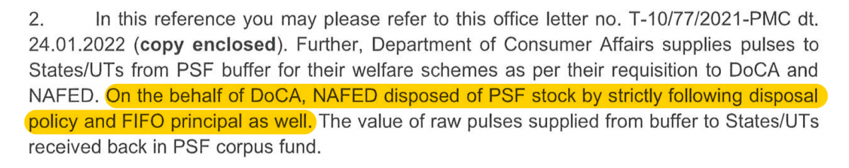 Despite the Council pointing out that First in First Out principle was not followed earlier and the former NAFED managing director explicitly discarding the principle for supplies under the PMGKAY, the DoCA lied in its RTI records. In its response to the Collective on March 8, 2022, the department said, unprompted, that the principle had been strictly followed for disposing of stocks under the Price Stabilisation Fund scheme.
