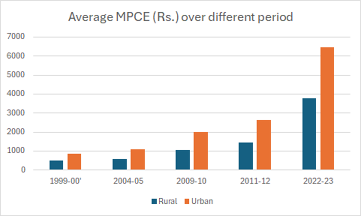 The period from 2009-10 to 2011-12 saw a remarkable surge in MPCE, suggesting a rapid increase in spending power amongst households possibly driven by robust economic growth. From 2011-12 to 2022-23, MPCE continued to rise steadily, but incomes in this period didn’t grow at the same pace for most income households. The widening gap between rural and urban MPCE levels over the years further highlights the ever deepening urban-rural economic gulf that has been explained (and exacerbated) by a K-shaped nature of economic growth trajectory, especially in the post-covid period.