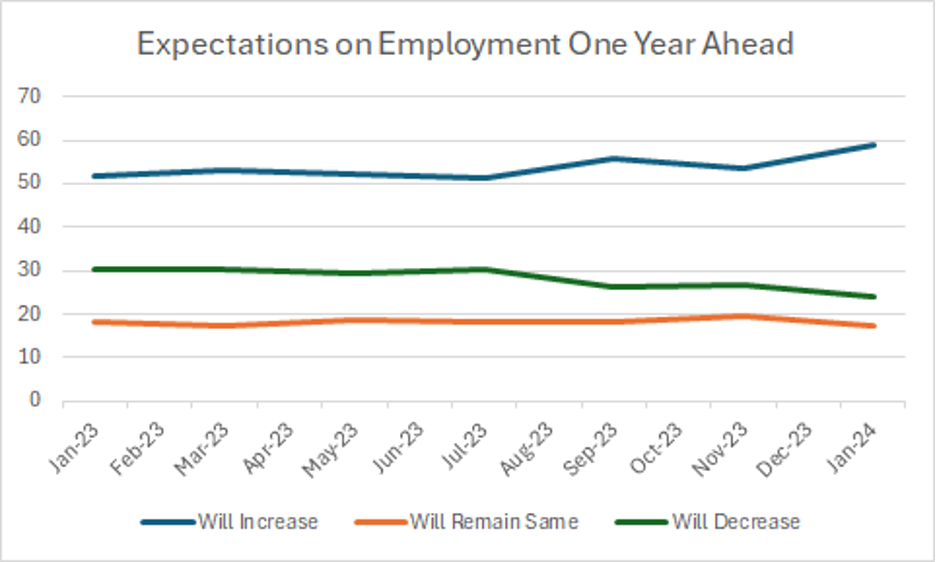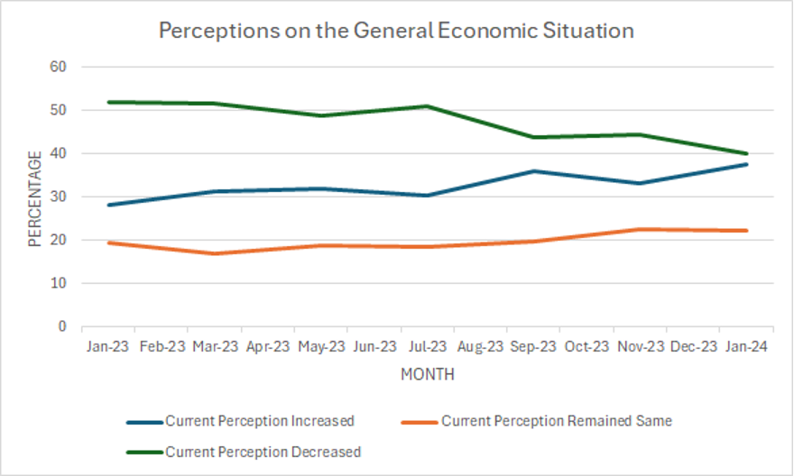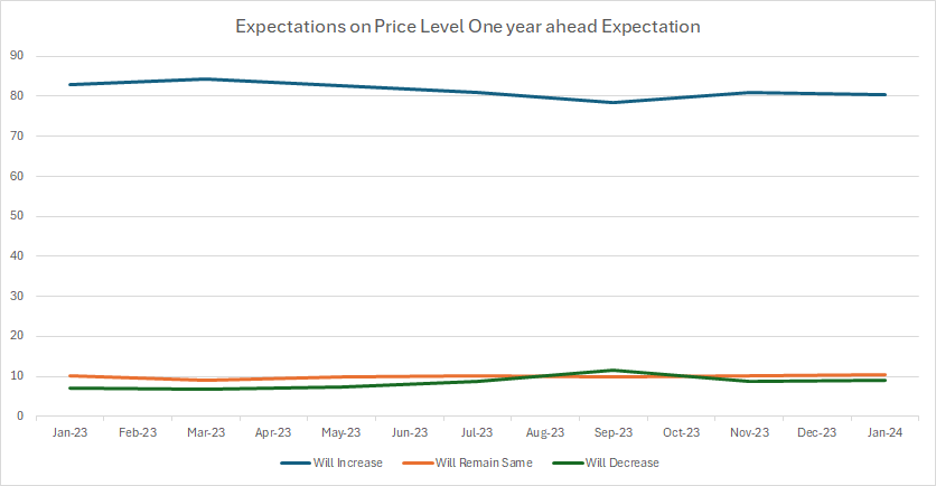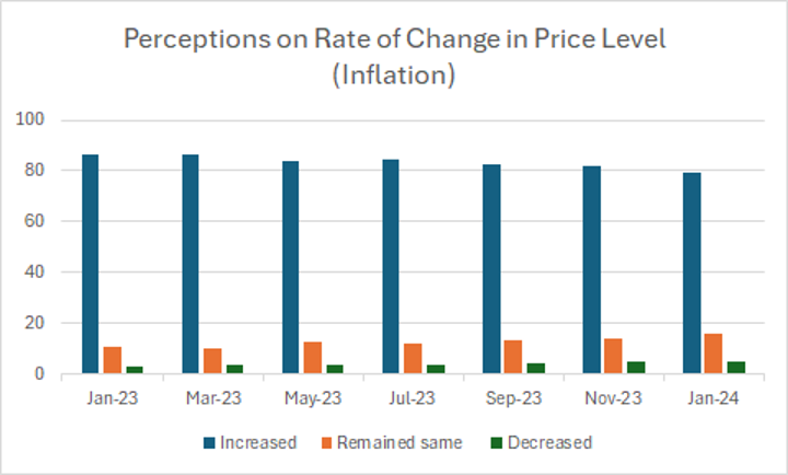 The data above illustrates a notable shift in perceptions regarding the rate of change in the price level (inflation) over the specified period from January 2023 to January 2024. There is a consistent decline in the proportion of individuals perceiving an increase in prices, decreasing from 86.5% in January 2023 to 79.5% in January 2024.