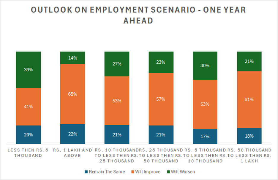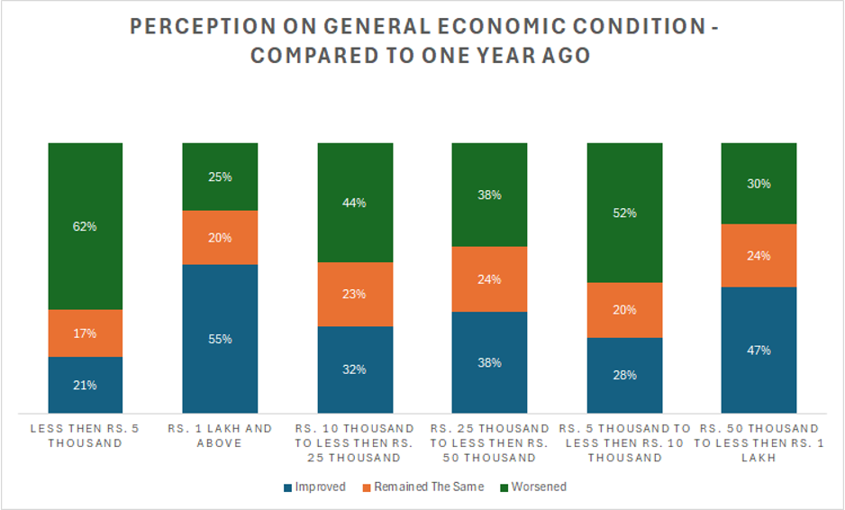 For individuals earning less than Rs 5,000, a concerning trend emerges, with the majority (62%) perceiving a monthly worsening economic situation. In contrast, only 21% report an improvement. This persistent negative perception suggests ongoing financial strain or challenges within this income group.