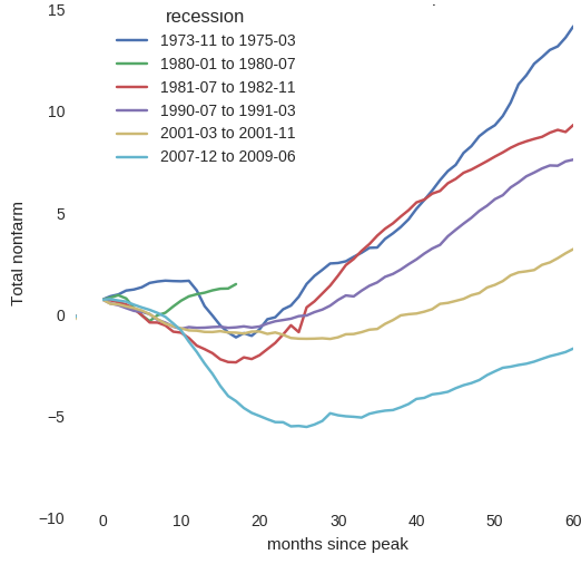 No two recessions are similar. For instance, what most macroeconomists and governments all over the world are concerned about is how well employment recovers from a recession. Consider the following case of the US. The graph shows the percentage change in total nonfarm employment since the start of each recession.