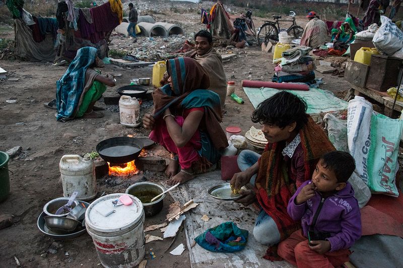 These mobile and floating populations of labourers are in a state of constant flux, moving between their home villages and different urban work destinations. Earning less than a living wage, they are unable to afford housing even in slum settlements, resorting instead to living in the open, in shared rented rooms in deplorable conditions or within the workplace.