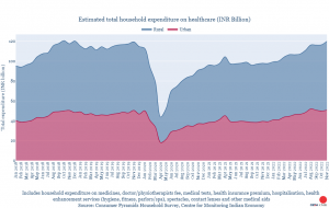 Indian households spent over Rs 120 billion on healthcare-related expenditure in November 2022, estimates based on data from the Centre for Monitoring Indian Economy’s Consumer Pyramids Household Survey (CMIE-CPHS) suggest. Urban India accounted for 42.3% of the total healthcare-related expenditure in this period, while the remaining 57.7% of the expenditure came from rural India.