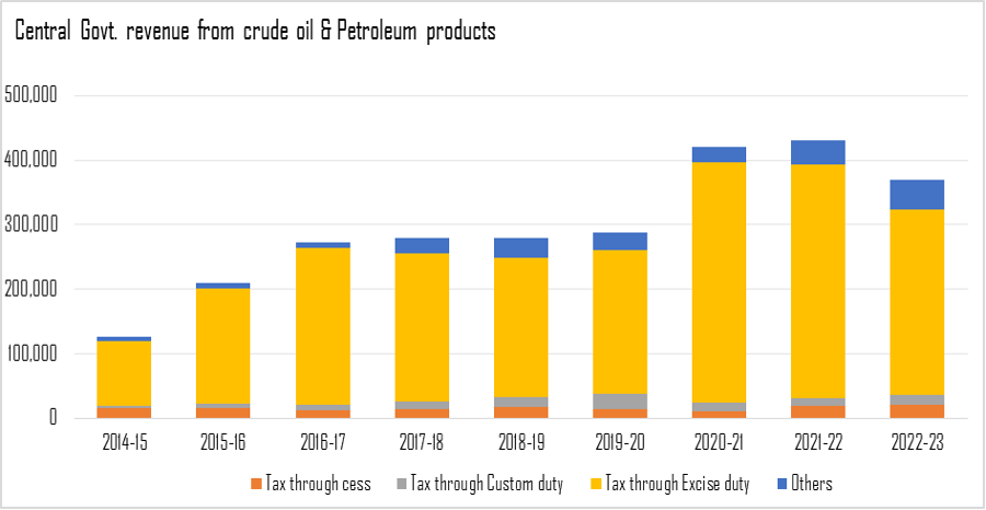 Fig D: Trend in the revenue generated through taxes / duties that Union has levied on the petroleum sector over the years. Source: Petroleum Planning & Analysis Cell