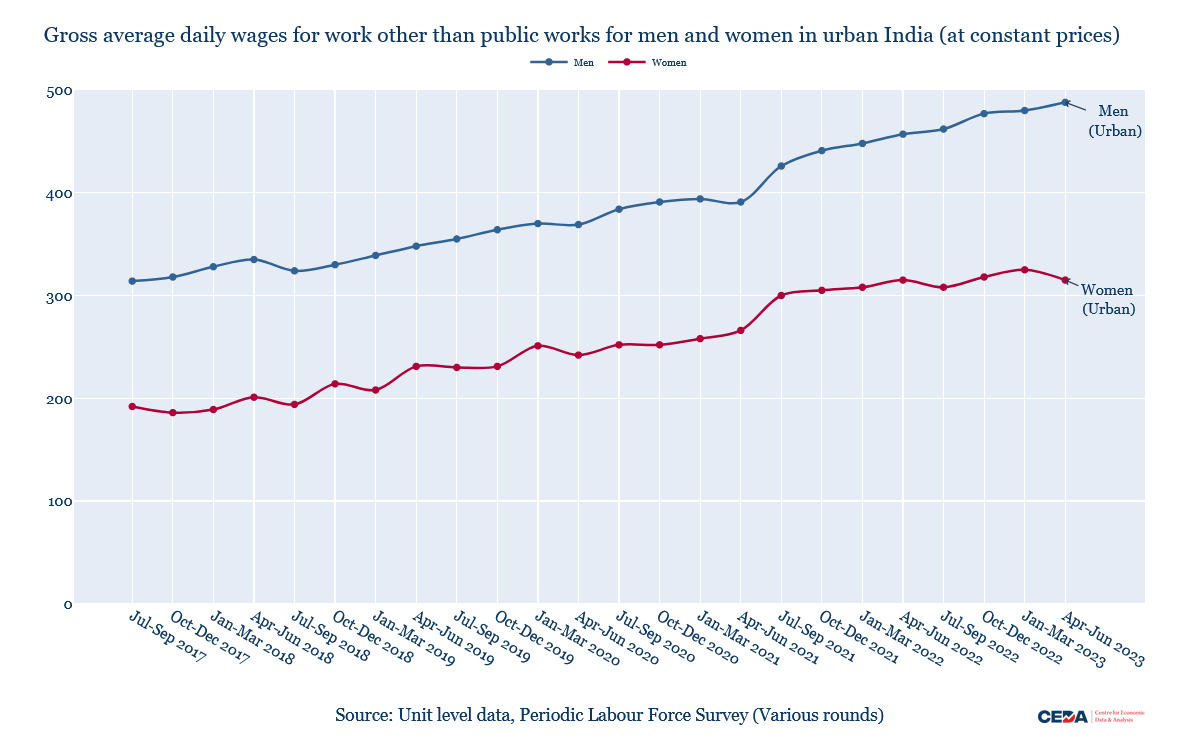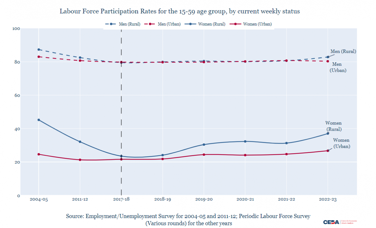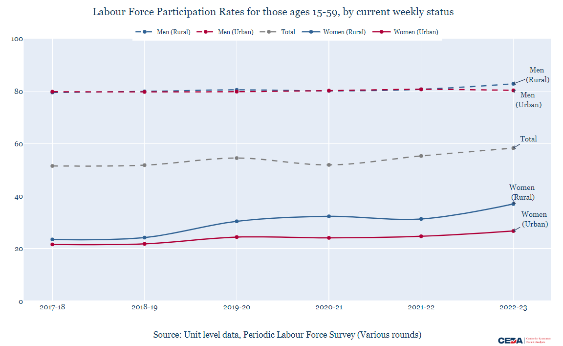 True to historical patterns, the urban FLFPR continues to be lower than rural, but both show an increase: 5 percentage points for urban and 14 percentage points for rural women. The pattern of increase in rural women’s LFPRs shows two big spikes of roughly 6 percentage points each: one between 2018-19 and 2019-20 and the second between 2021-22 and 2022-23. The corresponding urban increase was around 2 percentage points in both instances.