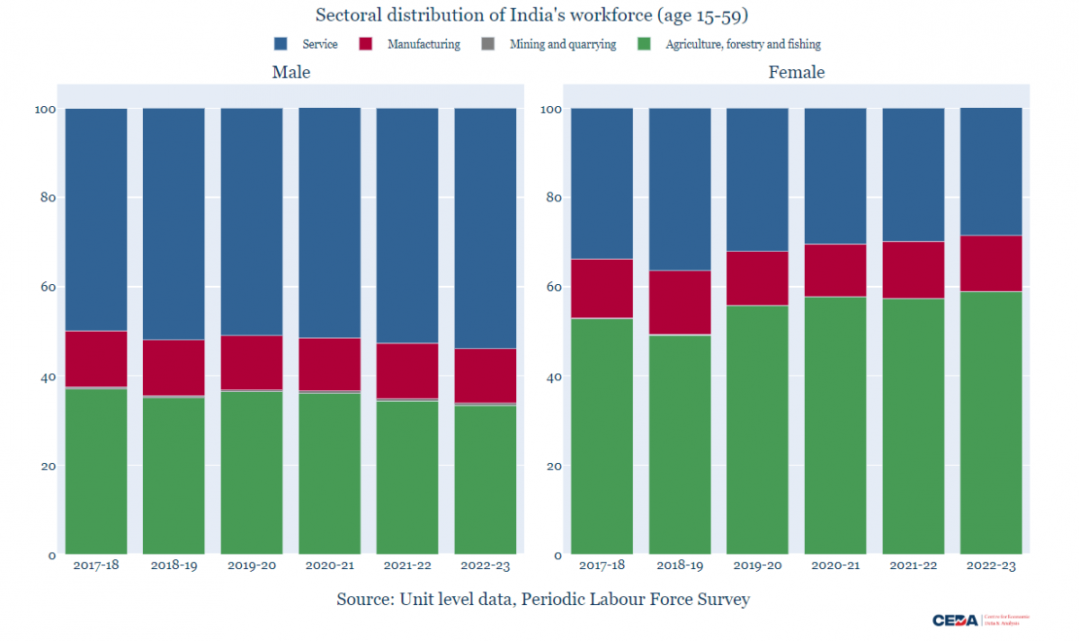 Between 2017-18 and 2022-23, the share of men who were employed in the primary sector (agriculture, forestry and fishing) declined from 37% to 33.4%. However, for women, this share went up from 52.8% to 58.8% (Figure 4).