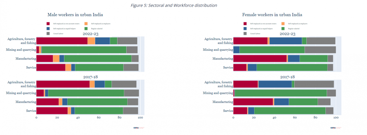 However, the proportion of women in regular salaried work with no social security benefits has increased from 54.9% to 58% in the rural areas and from 49.8% to 51.1% in urban areas. Among men, this share increased from 51.6% in 2017-18 to 59.3% in 2022-23 in rural areas, while in urban areas it increased marginally from 46.5% to 47% in the same period.