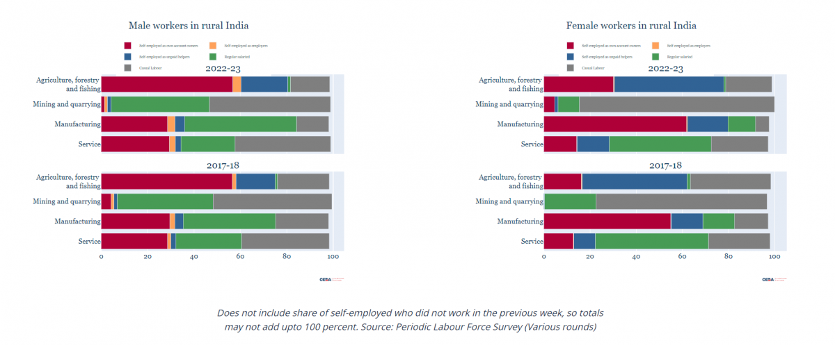 Focusing on rural women, there has been a steady increase in the proportion of women who are self-employed in agriculture, from 63.7% in 2017-18 to 79.1% in 2022-23, an increase of roughly 15 percentage points. There has also been an increase in the proportion of self-employed rural women in manufacturing and services, though the quantum of increase is smaller: 10 percentage points for manufacturing, from 71.7% to 81.8%, and six percentage points for services from 23.1% to 29.1% (even as the share of women working in manufacturing has only increased marginally while those working in services has seen a small decline). Thus, self-employment among rural women has occurred across sectors.