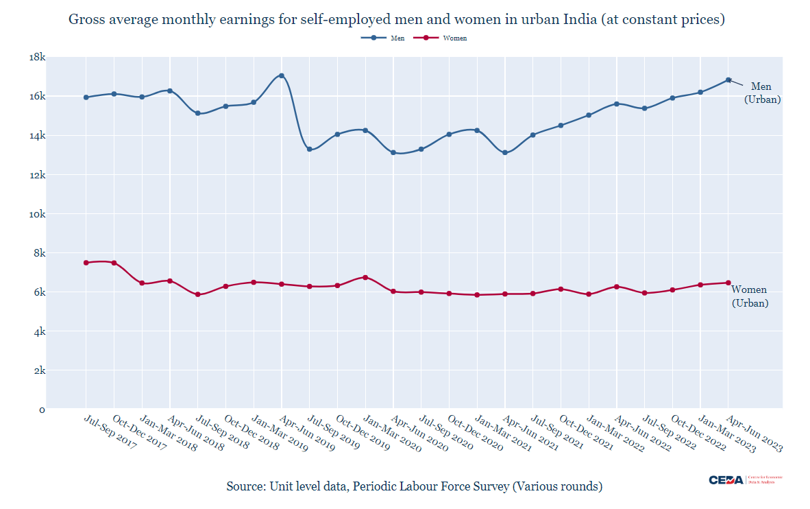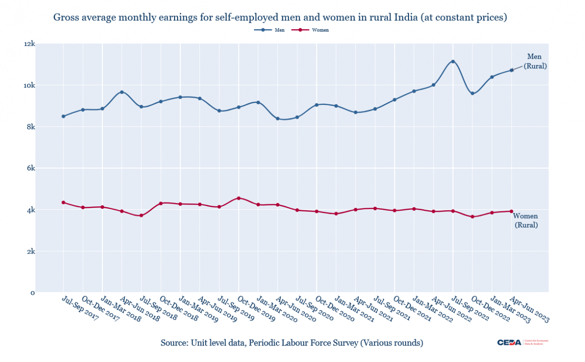 We see that the real gross earnings of rural self-employed women have declined over the six years for each quarter. For the April-June quarter, the ratio of their 2022-23 earnings relative to 2017-18 is almost unchanged at 99.8%. For all other quarters, we see a clear decline. The ratio is 93% (January-March); 91% for July-September and 89% for October-December. Thus, while PLFS is doing a better job of counting economic participation of women, it also reveals clear gaps in earnings of the self-employed, the category of women that is driving the increase in LFPR measurement.
