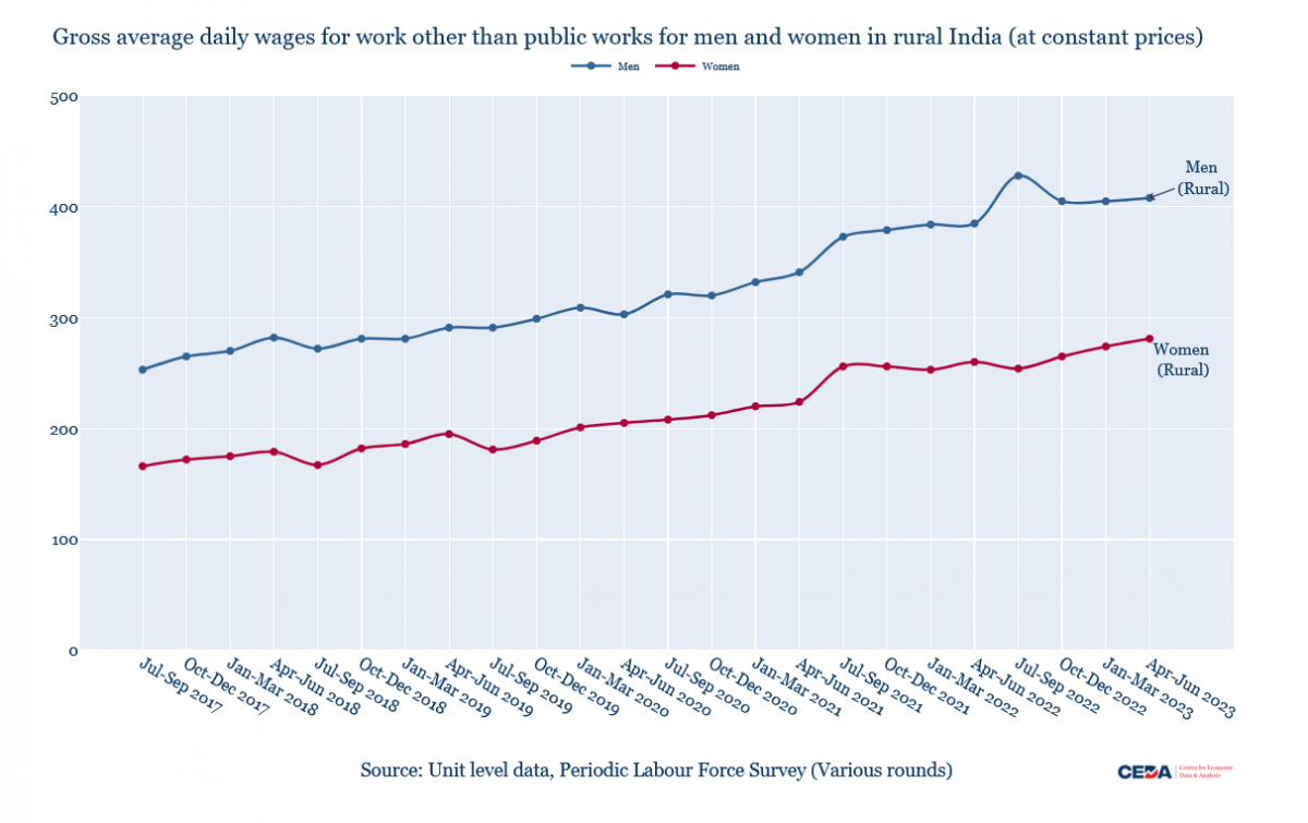 While the proportion of women in regular salaried work has not increased, we should note that daily wages for rural women have increased in real terms (Figure 7), as indeed they have for urban women.