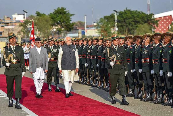 Prime Minister Narendra Modi inspects the Guard of Honour during the ceremonial reception in Kathmandu. Photo: PTI