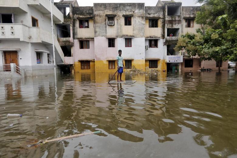 A man uses a board to float through a flooded street to reach to a market place in Chennai, December 5, 2015. Photo: Reuters/Anindito Mukherjee