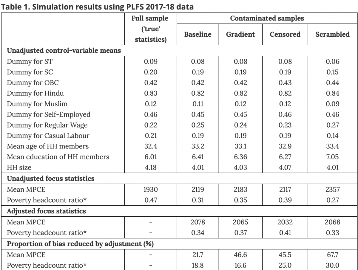 We then create artificially biased (or contaminated) samples by randomly dropping poor households from the full PLFS sample in four different ways. Using RW’s method (with similar, though not identical, control variables), we adjust the household weights in these contaminated samples and then re-estimate the focus statistics. If the correction method works well, these adjusted focus statistics from the contaminated samples should be quite close to the full-sample values.