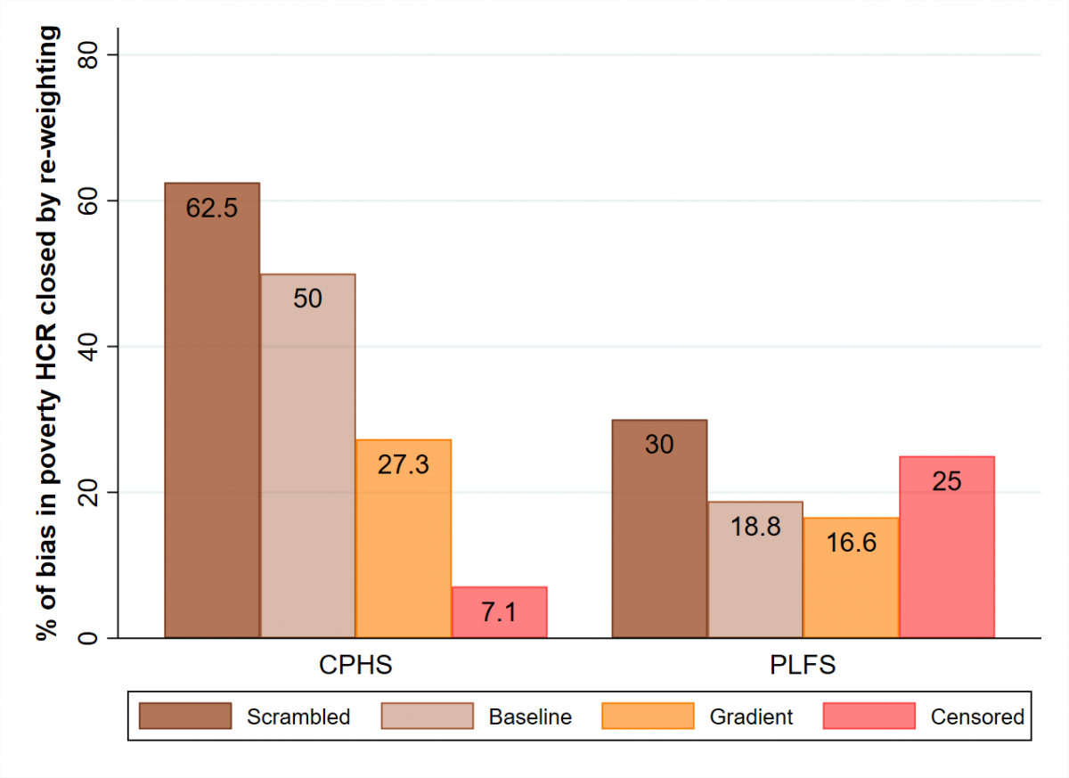 The reason why the adjustment method works better for the Scrambled variant is not difficult to understand. In this variant, contamination is partly based on dropping households at random among groups that are defined in terms of control variables rather than MPCE. The control variables, therefore, are well-placed to repair the bias. If we skip the first step in the Scrambled variant so that contamination is based exclusively on control variables, it turns out that the max-entropy method repairs almost 100% of the bias in focus statistics. This suggests that for some purposes, re-weighting may work quite well. For instance, if women are thought to be underrepresented in an opinion poll, more or less at random, then giving women more ‘weight’ (based on, say, Census estimates of the female-male ratio in the population) might correct the bias. Poverty estimation with CPHS data, however, is another matter.