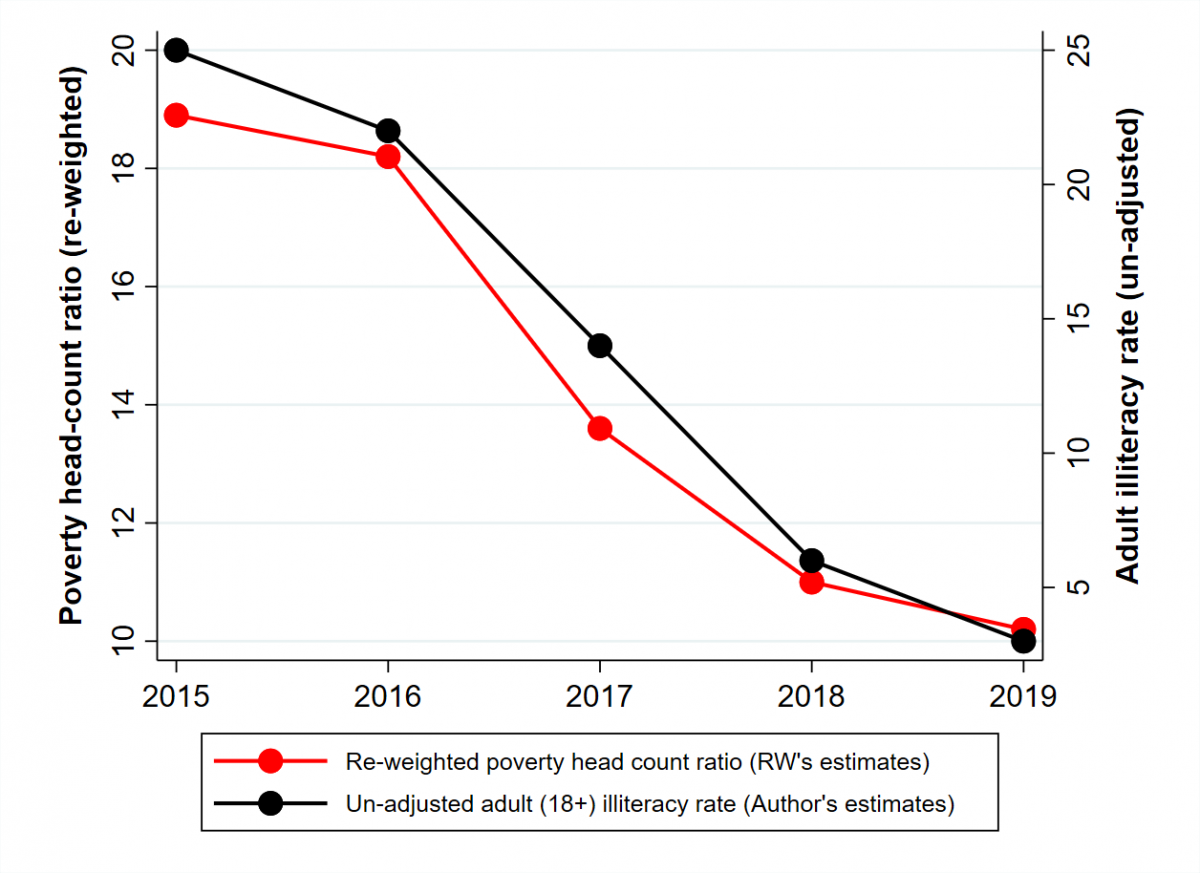 Notes: i) Poverty estimates are taken from Roy and van der Weide (2022), Figures 15 and 17. ii) Adult illiteracy rates are estimated from unit-level CPHS data using original design weights (scaled by a non-response factor) for each of the three waves of each year and then averaged across waves.