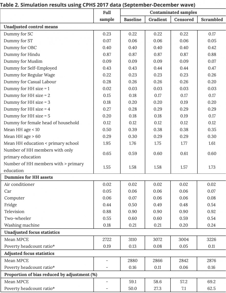 Table 2 is similar to Table 1, with CPHS data for 2017 replacing data from PLFS 2017-18. Once again, the contaminated control means are strikingly close to the full-sample means, except in the Scrambled variant. In this best-case environment, the max-entropy method performs better than before. For mean MPCE, it is able to repair more than half of the bias away from the true mean in all variants, and as much as 69% of it in the Scrambled variant. For the headcount ratio, however, the repair effectiveness varies widely, from just 7% in the Censored variant to 62.5% in the Scrambled variant. Figure 1 conveys this variation, for both datasets.