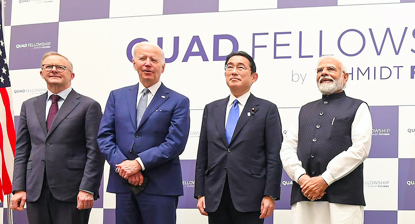 Prime Minister Narendra Modi, Prime Minister of Japan Fumio Kishida, U.S. President Joe Biden and Australian Prime Minister Anthony Albanese launch the Quad Fellowship, during the Quad Leaders’ Summit at Kantei Palace, in Tokyo, Tuesday, May 24, 2022. Photo: PTI/@PMOIndia